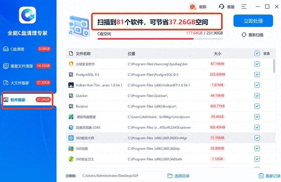 一款專注於Windows系統優化的工具,自帶的軟件搬家可以快速遷移C盤中的軟件。它能夠深度掃描C盤,識別可搬遷的軟件、遊戲和文檔,有效避免誤移系統文件的風險。它還提供清晰的界面,展示每個軟件佔用的空間大小,讓用戶一目瞭然地知道哪些是“空間大戶”,而且遷移過程經過專門優化,在保證數據完整性的前提下實現較快的遷移速度。