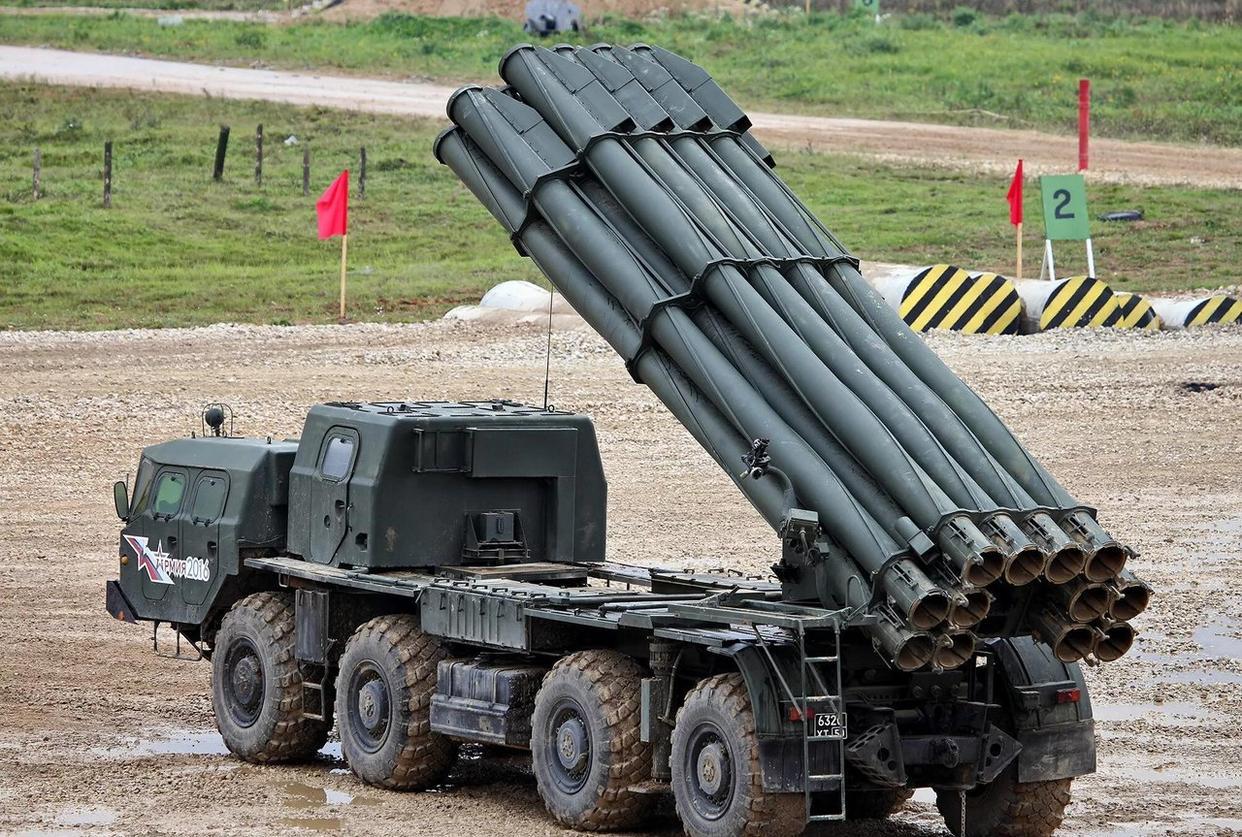 俄羅斯的BM-30“龍捲風”火箭炮是繼承蘇式武器設計的典型代表,簡單、粗暴、量足。這款300毫米口徑的火箭炮系統最大射程約90公里,改進型“龍捲風-S”射程提高到120公里。