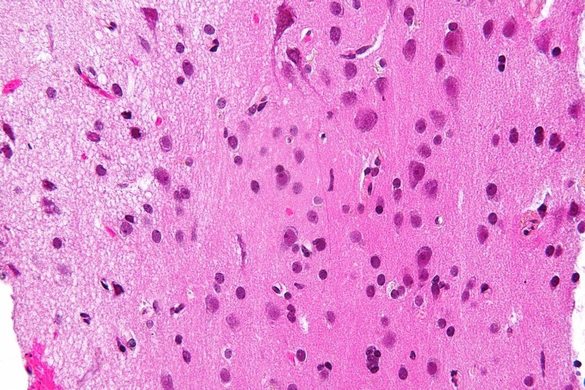 顯微照相下的白質(圖的左邊,淺粉紅色部分)