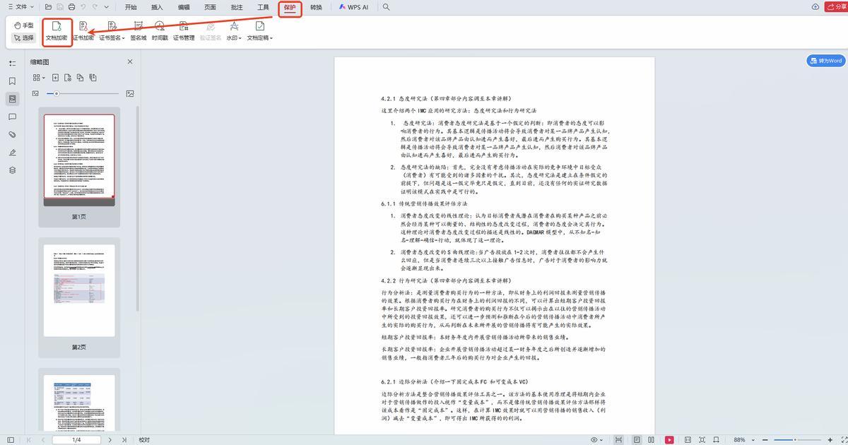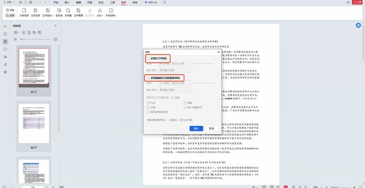使用WPS打開PDF,點擊【保護】中的【文檔加密】,根據需求勾選設置打開密碼或者設置密碼及頁面提取密碼,輸入密碼後點擊【確認】即可。