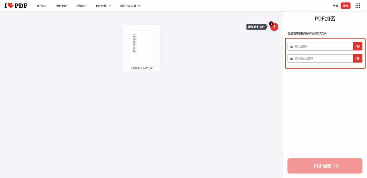 操作也不難,在首頁找到【PDF加密】,導入PDF文件,設置PDF加密的密碼,最後點擊【PDF加密】即可。