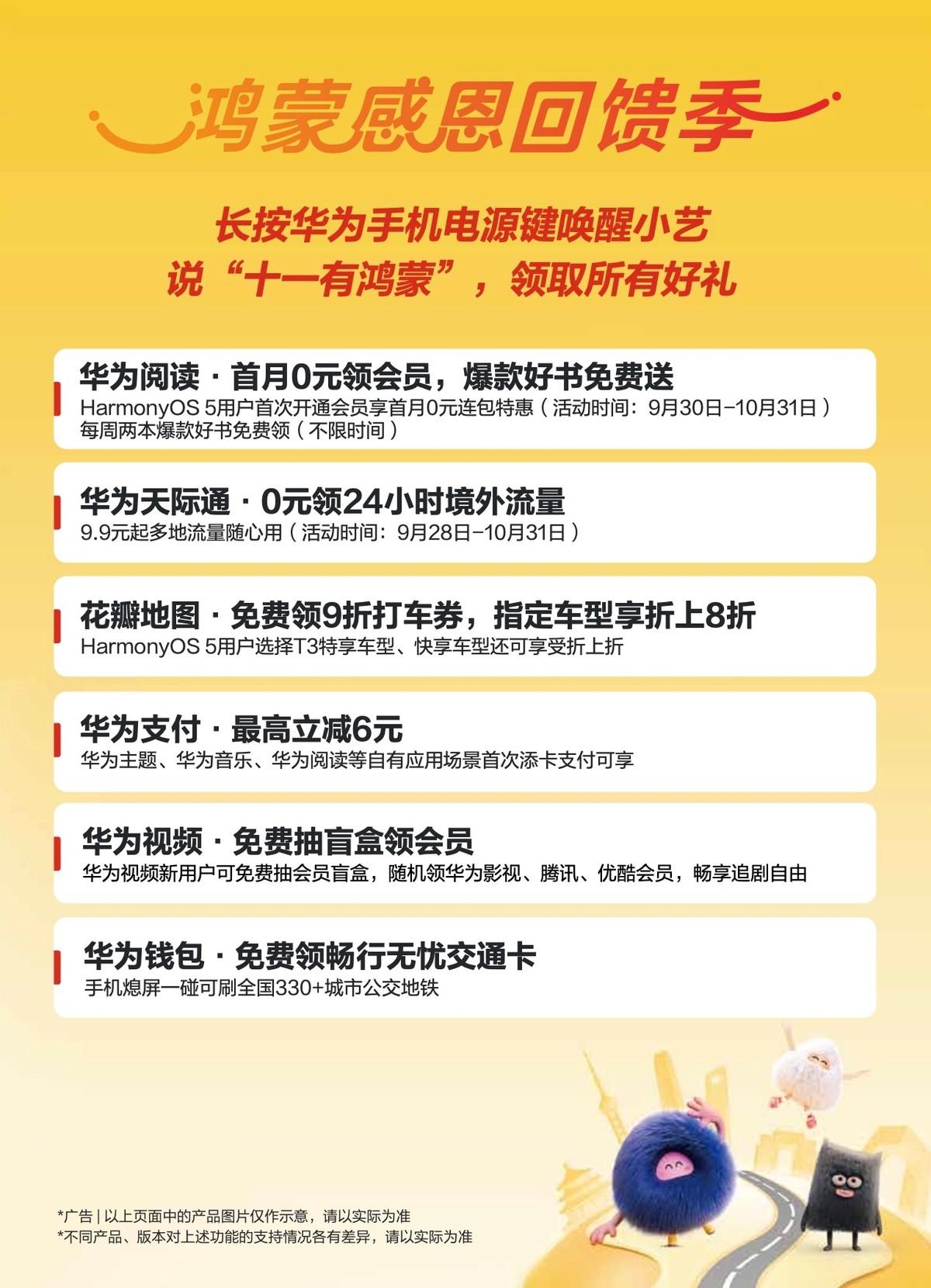 要是你國慶也打算去露營徒步,以上這些功能也趕緊試起來!9月30日前升級至HarmonyOS 5.1,右滑至“負一屏”的“鴻蒙有禮”完成首籤並每日簽到,即可領取現金紅包和包含華爲視頻、華爲音樂、華爲閱讀等會員在內的多重隨機權益!不僅如此,十一期間長按華爲手機電源鍵喚醒小藝,說“十一有鴻蒙”,華爲天際通0元領24小時境外流量、花瓣地圖免費9折打車券,指定車型享折上八折等好禮等你領,趕緊行動吧!