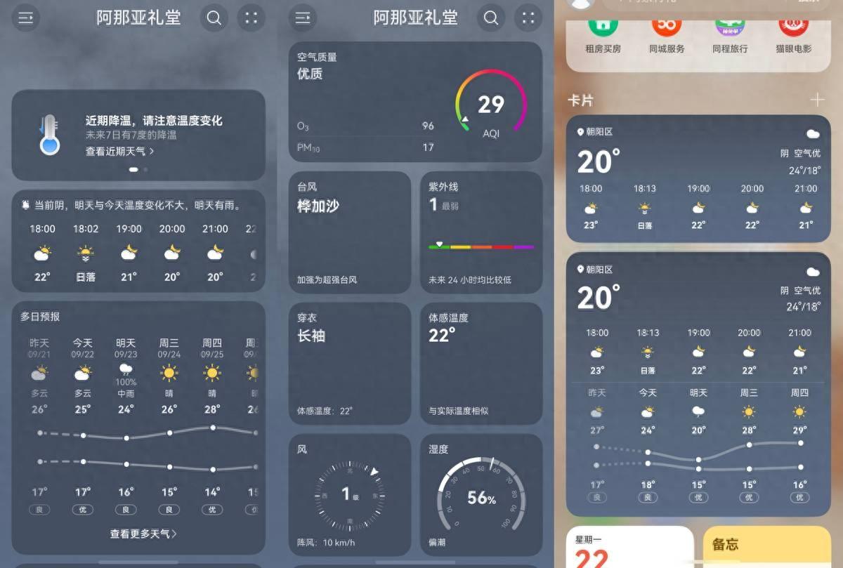 出門露營的天氣有時候真是“玄學”,明明是個大晴天結果被大風颳懵、被大雨澆透都遇到過,所以信息準確、數據豐富的華爲天氣就幫上大忙了。它能預測未來幾小時到15天的天氣變化,降水概率、風力風向、紫外線強度這些實用數據全有,如果最近有氣溫變化,它還會在天氣頁面提醒你,甚至給到穿衣建議。桌面或者負一屏也都支持多種天氣卡片,不用特意點開App,把卡片放自己習慣看的位置,掃一眼就能知道天氣變化。在戶外開心徒步,就靠它“劇透”的天氣啦!