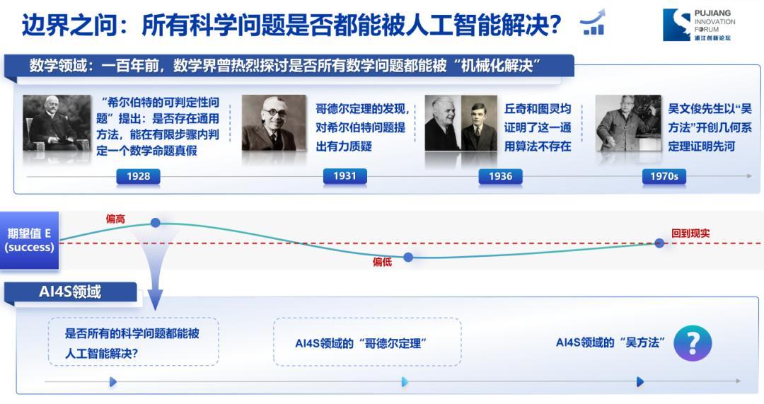 今天我們面對 AI for Science,亦應懷抱同樣的思考:在大家紛紛投身這一領域的同時,是否認真追問過它的能力邊界?“邊界之問”可視爲“AI for Science 的希爾伯特之問”。如果我們認同這是一個根本性問題,那麼“AI for Science 的哥德爾定理”在哪?誰將成爲破解這一難題的“圖靈”和“丘奇”?誰又能提出屬於我們這個時代的“吳方法”?