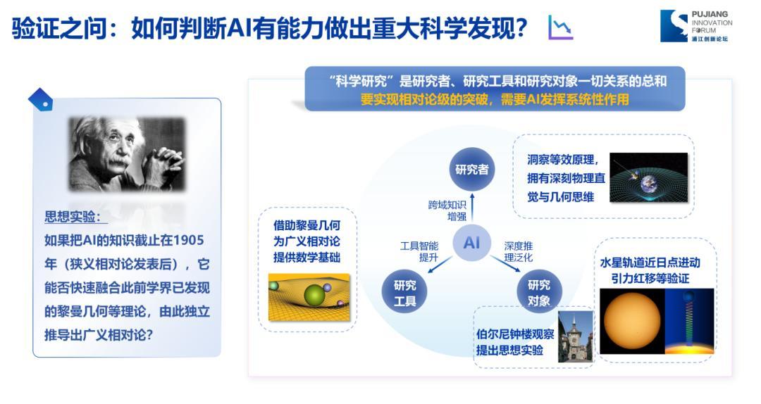 自 2022 年以來,我持續思考一個思想實驗,並將其確立爲團隊和學生的核心研究課題。實驗的設定如下:假設我們開發出了一套卓越的 AI for Science 系統或大模型,那麼應如何驗證其科學發現能力?我的提議是:將該系統“送回”1905 年(那一年愛因斯坦剛剛提出狹義相對論),限定該AI系統僅基於1905年之前的所有科學論文與已知觀測結果,那麼它能否自主推導出廣義相對論?我認爲,這是衡量“AGI for Science”能否實現終極突破的關鍵設問。