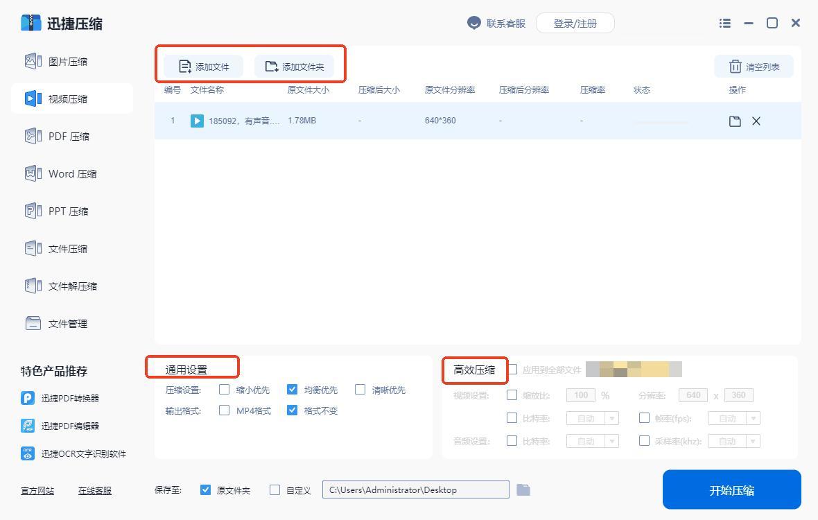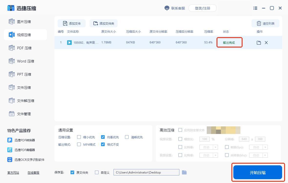 最後點擊右下角的【開始壓縮】,就能快速將視頻壓縮成功,使視頻的體積變小,並將壓縮後的高清視頻保存在指定文件夾中。