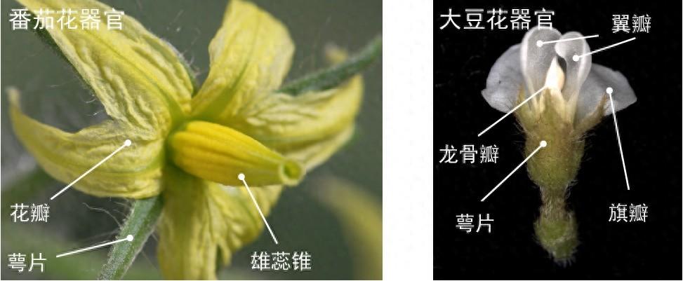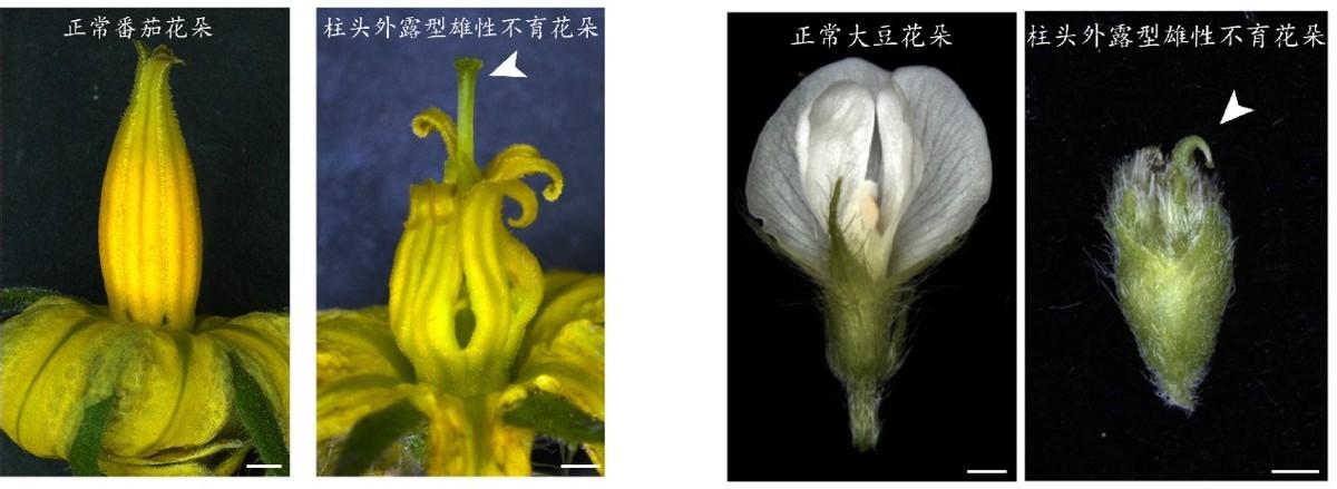 隨着社會發展,人們對育種效率的要求越來越高,作物花型已經成爲限制雜種優勢利用、提高育種效率的一大瓶頸。以番茄爲例,它的雄蕊像一個“錐形”的小燈籠,雄蕊錐把雌蕊緊緊包裹,幾乎不給外來花粉“插足”的機會。大豆更是“鐵桶陣”,龍骨瓣緊緊包裹,柱頭完全藏在其中,人工授粉不僅耗時,還常常失敗(圖1)。