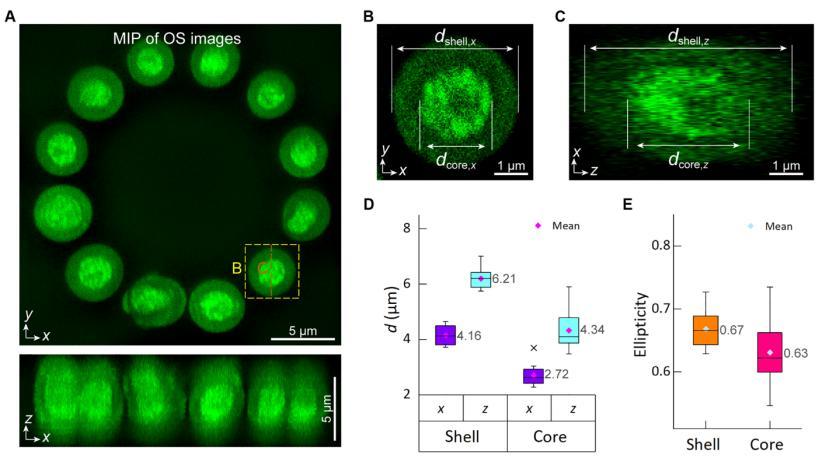 酵母細胞幾何結構的三維成像。D爲12個細胞的殼層與核心直徑統計;E爲所有細胞的殼層與核心橢圓度統計。