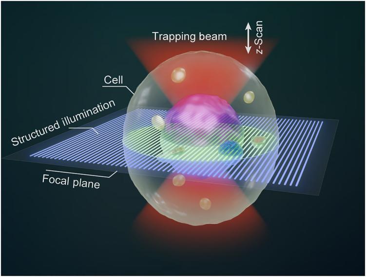 解決了“抓穩”的問題,接下來就是“合拍”。當瓣狀光鑷牢牢固定住懸浮細胞後,SIM系統會逐層掃描它們,用結構光對細胞進行三維成像。整個過程中,細胞既不會被化學試劑傷害,也不會被機械力擠壓,更接近自然的懸浮狀態。