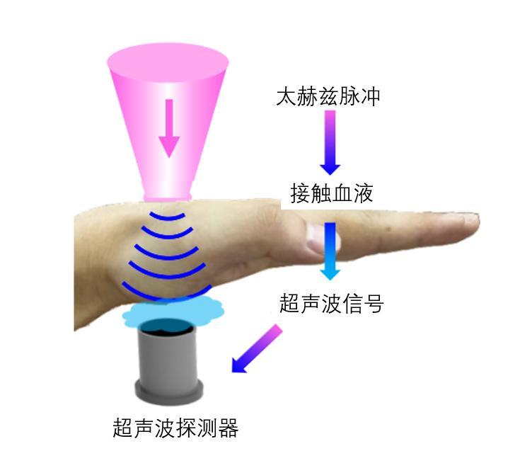 第一步,太赫茲光聲系統發射太赫茲脈衝,脈衝一個接一個地穿透組織到達血管,被血管中的水、血糖以及各類離子吸收;第二步,吸收太赫茲能量後,這些物質會發出不同種類的超聲波;第三步,太赫茲光聲系統中接收超聲波的儀器收到超聲波後,篩選出鈉離子所發出的特定種類超聲波,超聲波信號的強弱能夠反映鈉離子含量的多少。