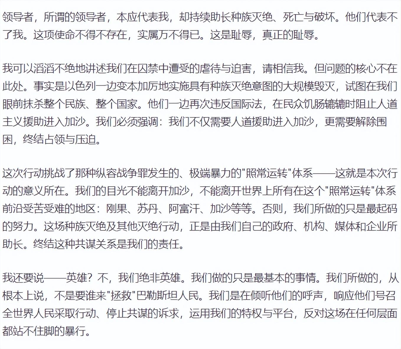 3、她號召所有人關注加沙,呼籲全球人民採取行動,希望媒體等社媒發揮作用,去拯救巴勒斯坦人民。