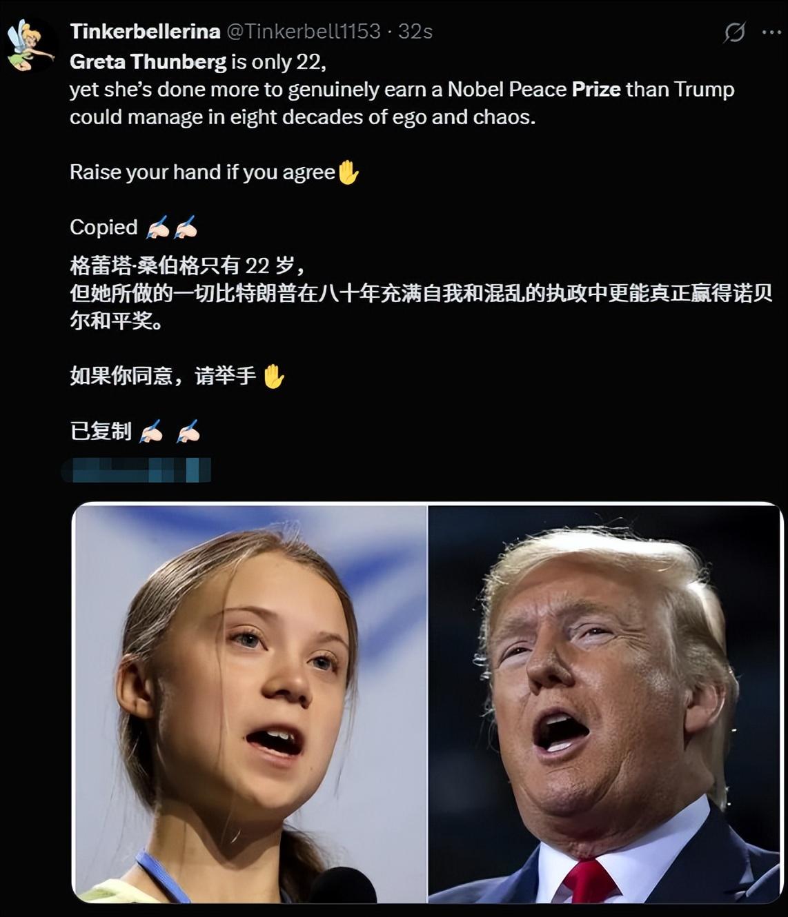 環保少女被以色列驅逐出境後首次發聲。特朗普的天塌了!他心心念唸的搞笑諾貝爾……哦,不,諾貝爾和平獎,環保少女或成最大競爭對手。