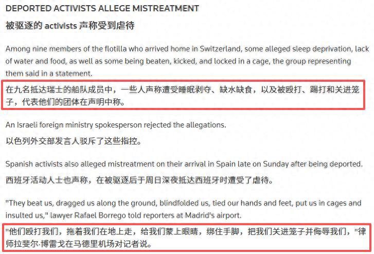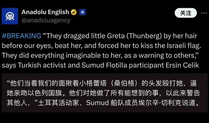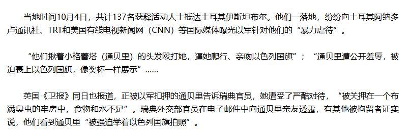 前幾天在她率領“全球堅韌船隊”前往支援加沙的路上,抵達加沙附近時再次被以軍逮捕。隨後在10月4日,根據多家媒體報道,一些被以色列釋放出來的活動人士表示,他們遭受了非人的對待,食物和水都無法保證,以軍還不讓他們睡覺,毆打他們,甚至是把他們關到籠子裏。