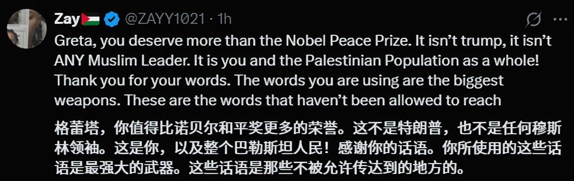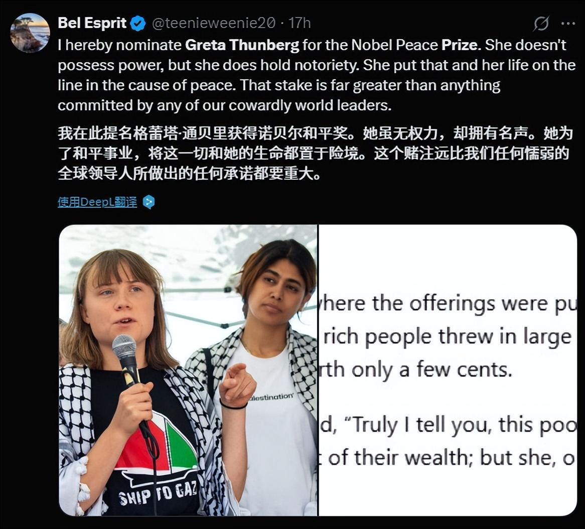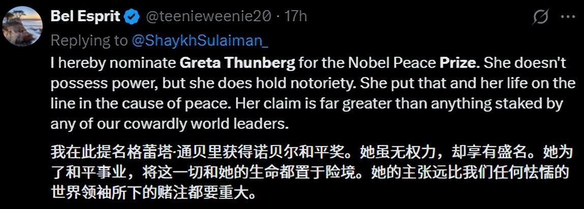 環保少女這一次的行動,也讓她獲得了不少人的好感。最近剛好正值諾貝爾獎頒獎週期,外網不少人號召,把諾貝爾和平獎授予環保少女,以表彰她爲加沙所做的努力。
