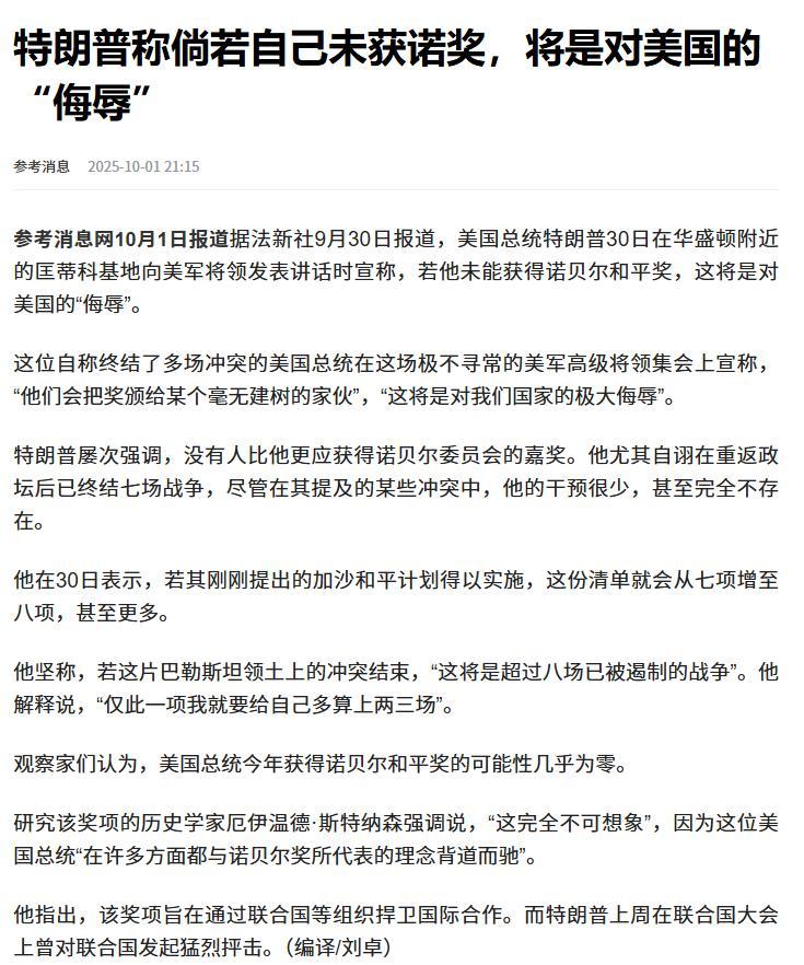 我都替懂王想好,如果不給他和平獎,該咋制裁挪威了。先給挪威三文魚等海產品加徵100%關稅,給挪威石油和天然氣設定價格上限,然後制裁諾貝爾委員會,諾貝爾遺產投資在美國的部分,不能免稅,還得把過去100多年的稅補繳掉。實在不行,還可以下令,獲得諾獎的人,不能入境美國,特朗普,你就這麼幹,這和平獎絕對就是你的了。