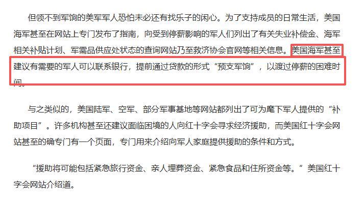 而美國呢,也不是毫無作爲,他們表示,雖然發軍餉的部門停擺了,但是發貸款的部門還在上班啊, 美國海軍建議有需要的軍人可以聯繫銀行,提前通過貸款的形式“預支軍餉”,以渡過停薪的困難時間。美國紅十字會網站,甚至專門有一個頁面,介紹向軍人家庭提供援助的條件和方式。