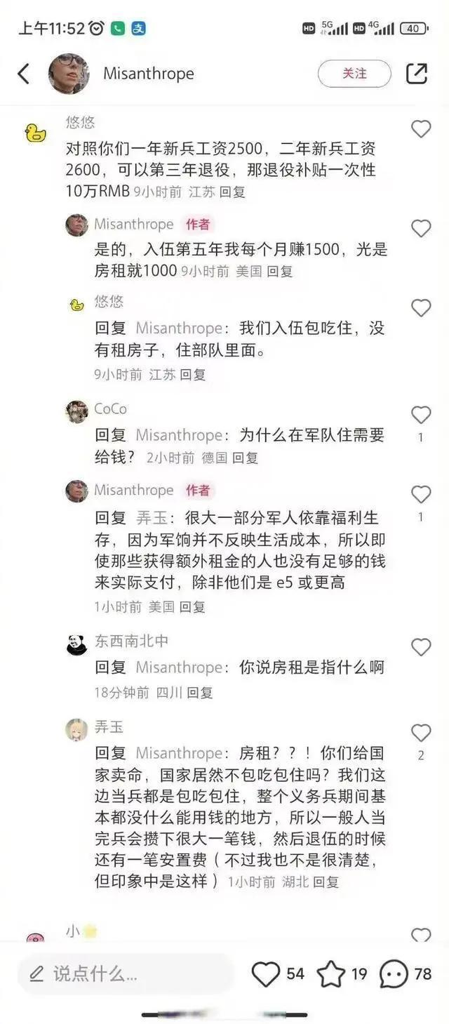 美軍在軍隊住還要付房租,有個美國網友說,入伍第五年我每個月賺1500,光是月租就要1000。中國網友都覺得不可思議啊,啥,在軍隊住還要給錢,我們都是入伍包喫包住。美國網友又回覆說,很大一部分軍人依靠福利生存,因爲軍餉並不反映生活成本,所以即使那些獲得額外租金的人,也沒有足夠的錢來實際支付,除非他們是E5或者更高。