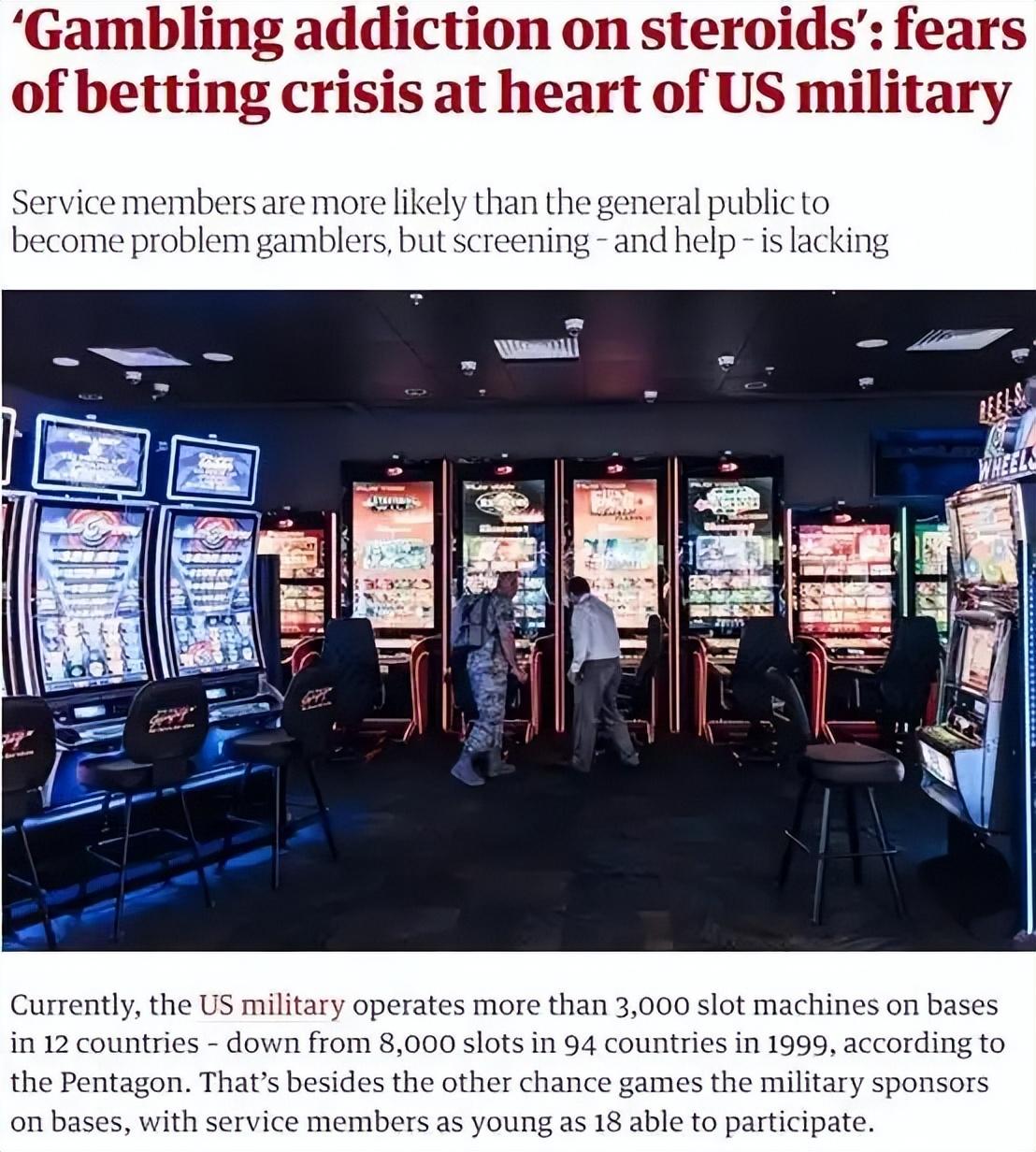 這還不是全部,你敢相信嗎,美國軍隊還經營賭場,客人就是美軍,五角大樓數據顯示,美國軍隊在12個國家的基地,運營着超過3000臺老虎機,這還不包括軍隊在基地贊助的其他機會遊戲,這些機器每年給軍方盈利超過1億美元,雖然這些都是美國的海外基地,美國本土不會這樣,但是,美國本土軍營周圍同樣也有類似設施,一些美軍辛辛苦苦賺的錢,轉手又給輸沒了,怪不得美軍退役後,很容易流浪街頭,成爲社會不安定因素。