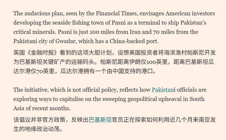 《金融時報》報道,巴基斯坦計劃吸引美國,在帕斯尼開發港口,配套項目還包括一條新鐵路,建成之後將可以運輸銅和銻等關鍵礦產,這倆是電池、阻燃劑和導彈的重要成分,其中銻自從中國出口管制之後,美國被卡脖子,銻價暴漲。