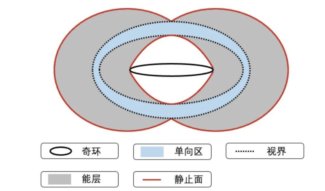 仔細回憶一下我們在本系列的第六篇《旋轉的時空》中所說的,克爾黑洞的核心,不再是一個“點”,而是一個環狀奇點(Ring Singularity),它被稱爲“奇環”。這個發現,在廣義相對論的歷史上,是革命性的。它就像在宣告世界末日的判決書上,突然出現了一個小小的豁免條款。