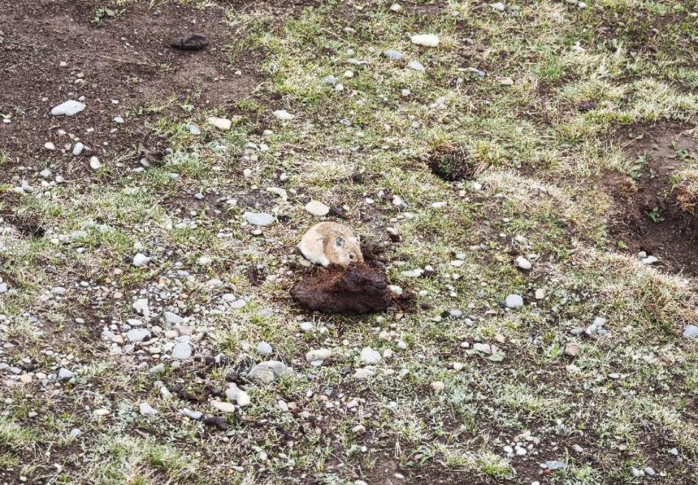 一隻趴在新鮮牛糞上專心“乾飯”的高原鼠兔