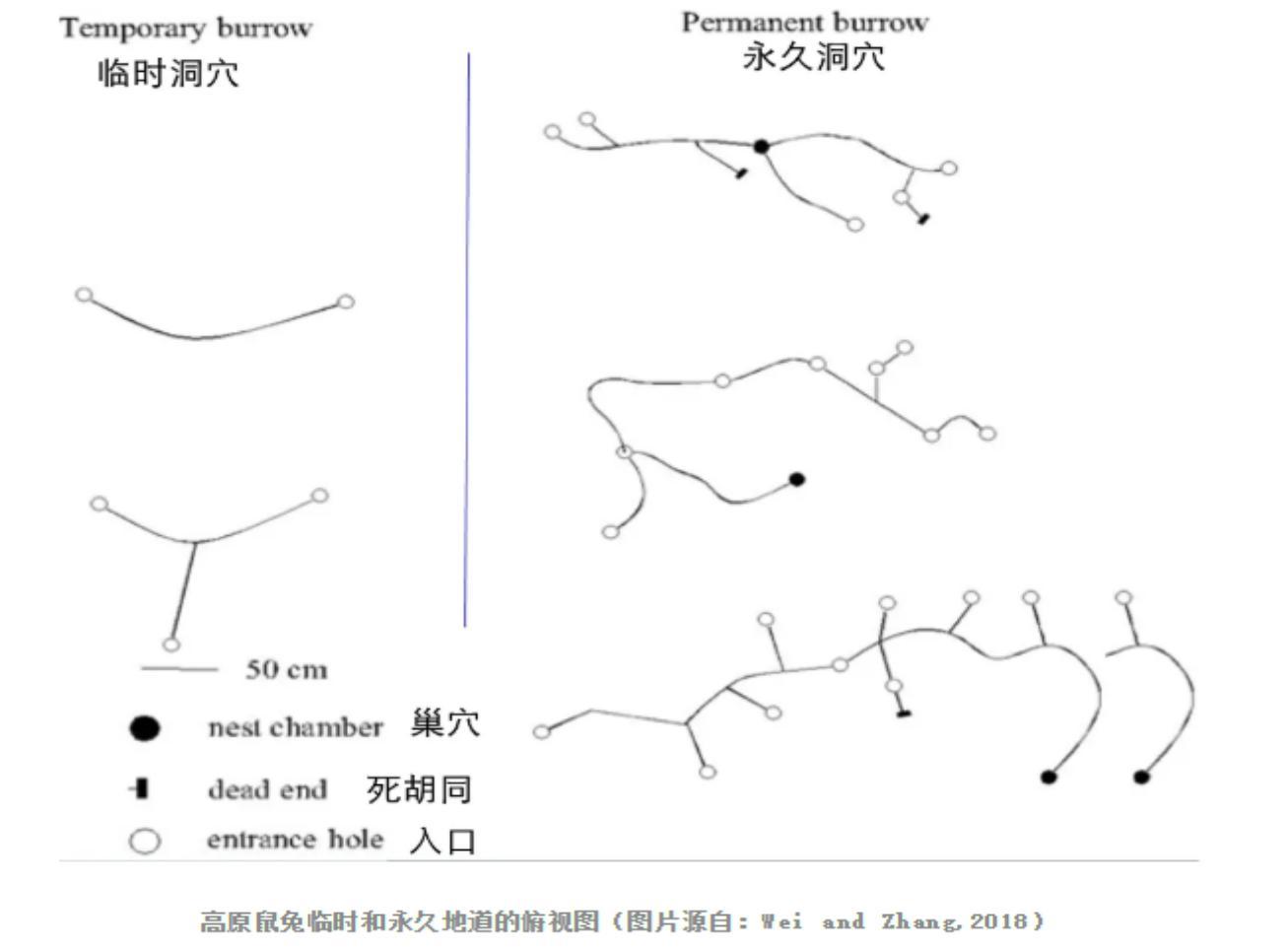 高原鼠兔洞穴系統的俯瞰示意圖