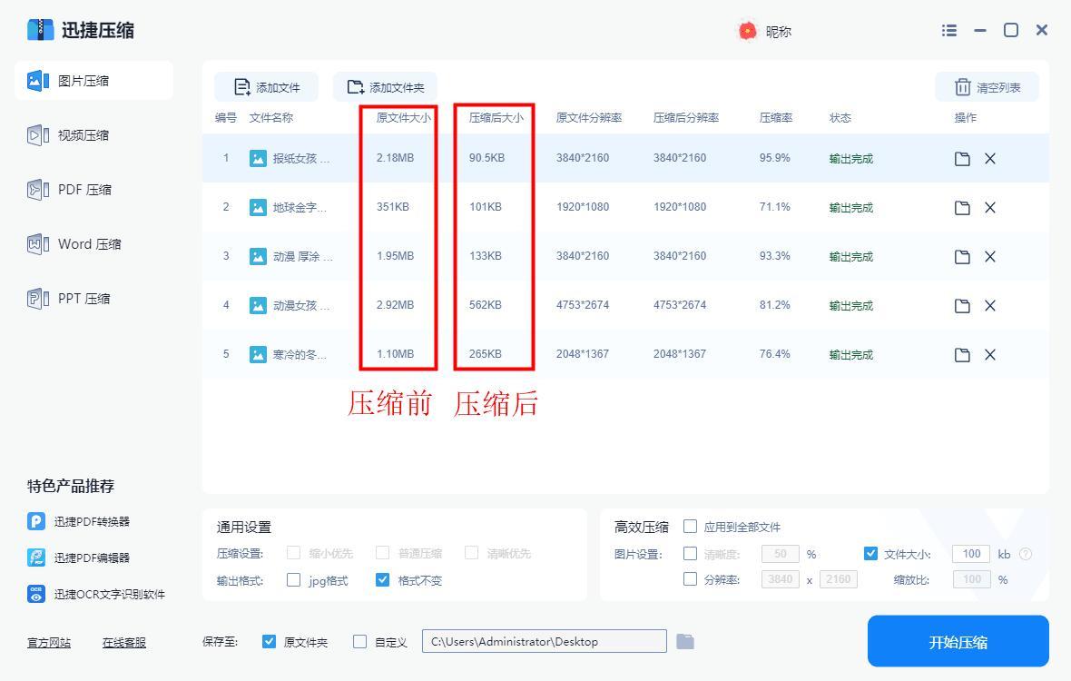 最後點擊右下角的【開始壓縮】,即可輕鬆將圖片壓縮成功,還能在當前界面看到壓縮前後的文件大小以及壓縮率,壓縮後的圖片畫質也很高清。