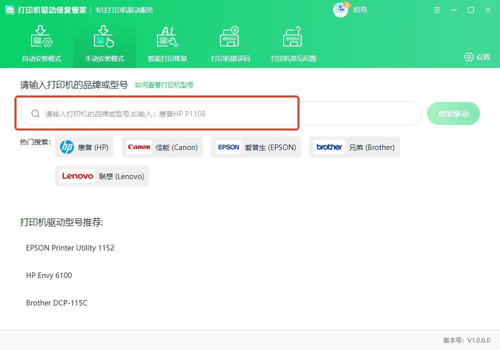 如果沒有自動安裝,也可以使用手動安裝模式來安裝打印機驅動。操作也不難,在搜索框中輸入你的打印機品牌或者型號,點擊【搜索驅動】。