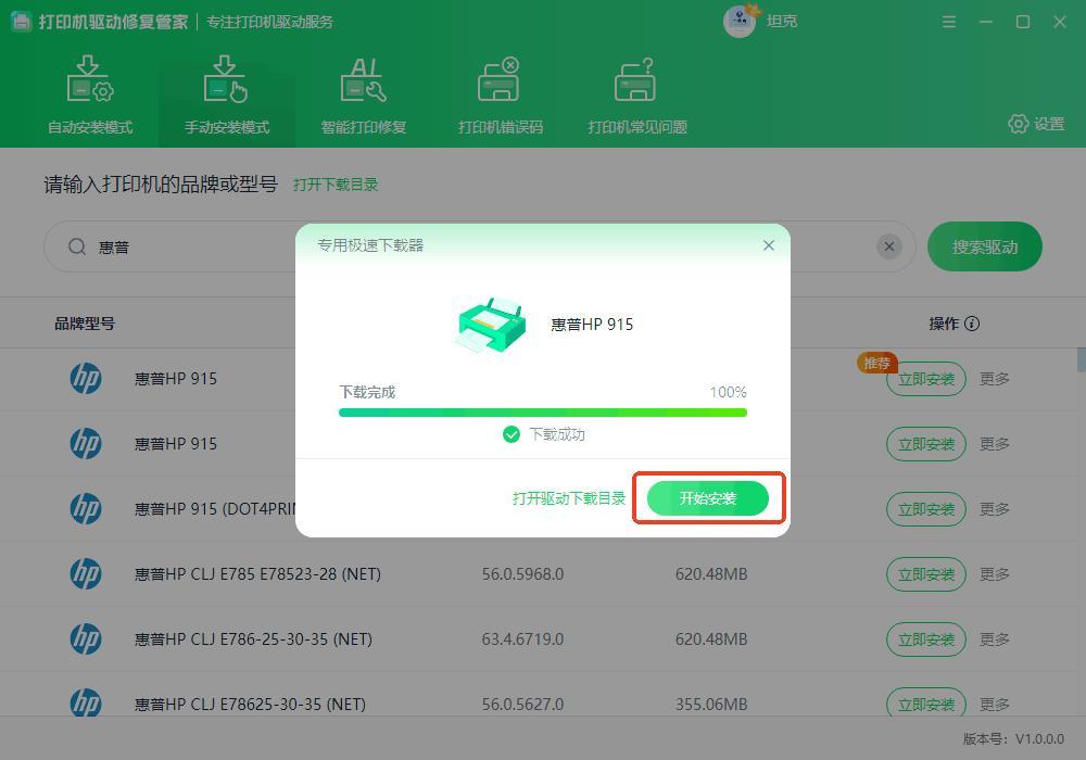 下面就會自動出現對應的驅動型號,找到一個適配的驅動,點擊【立即安裝】,軟件就會自動下載,接着點擊【開始按照】即可快速爲打印機安裝好驅動,非常實用。