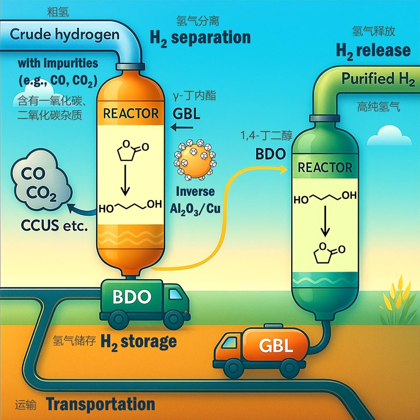 中國科研團隊研發的氧化鋁/銅基催化劑成功突破了這一限制。該催化劑能在一氧化碳等雜質濃度超過50%的苛刻條件下,高效催化γ-丁內酯(GBL)加氫生成1,4-丁二醇(BDO),儲氫密度達4.4wt%。這就相當於1,4-丁二醇是一個特別能“裝”氫氣的容器,4.4wt%即每100克1,4-丁二醇裏能“裝”進去4.4克氫氣。