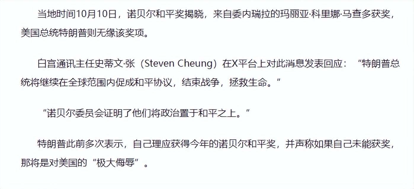 可能是知道特朗普心情不好,白宮出來安慰了,說什麼:“諾貝爾委員會證明了他們將政治置於和平之上。”,還說 “特朗普總統將繼續在全球範圍內促成和平協議,結束戰爭,拯救生命。”