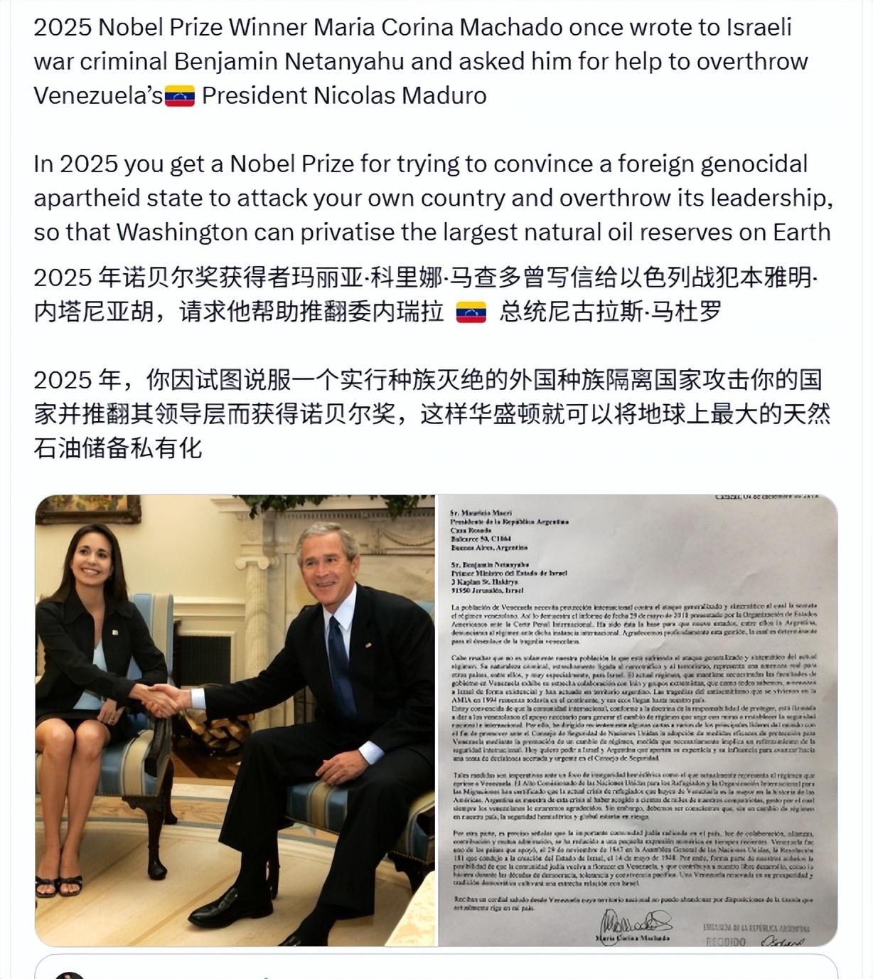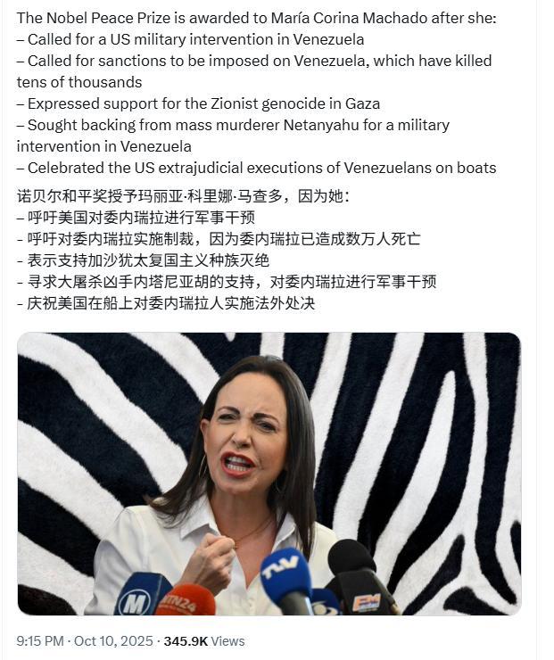 不過有一說一,諾貝爾和平獎確實是政治獎,今年拿獎的雖然不是特朗普,但卻跟美國緊密相關,馬查多是委內瑞拉的反對派領導人,以挑戰查韋斯和馬杜羅政權而聞名,說白了就是在委內瑞拉搞顏色革命的。