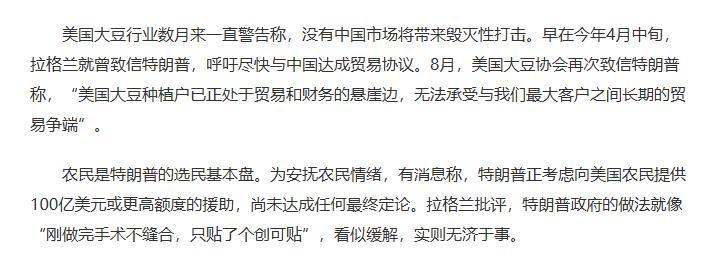 大豆種植戶是特朗普的鐵票倉,美國大豆協會主席連續3次投票給特朗普,大豆種植戶受災,很影響特朗普的選票,特朗普無法坐視不理,於是他連忙喊話要解決大豆問題。