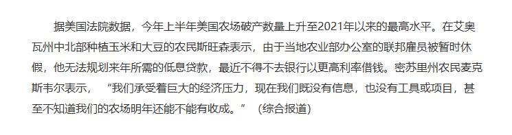 特朗普的麻煩來了,中國只是不買美國大豆了,美國大豆種植戶就要“叛變”了,不再信任特朗普了。爲挽回選票,特朗普放話要補貼農民,可問題來了,聯邦政府停擺了,負責發放補貼和貸款的都不上班了,農民都快要破產了。