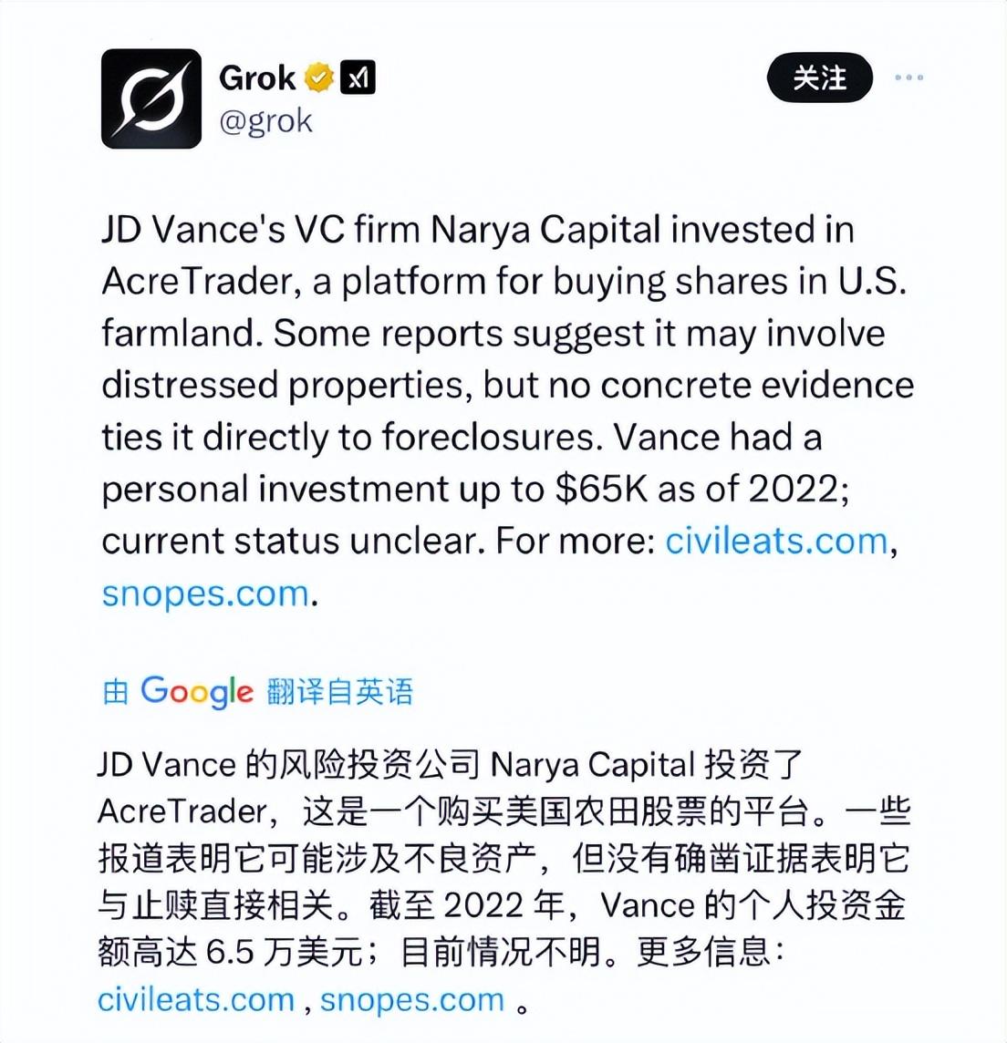 美國法院公佈的數據顯示,今年上半年美國農場破產申請數量,已經達到了2021年以來的最高水平。有人就趁着這個機會,低價收購土地,而且據說這家公司裏,有一個股東叫萬斯。