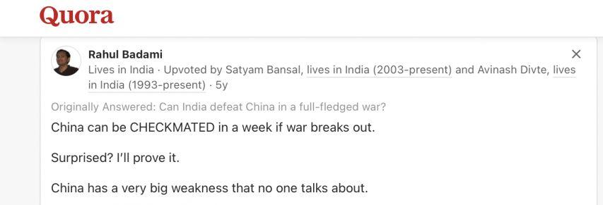就比如,有一位名爲拉胡爾·巴達米的印度網友,就曾在美版知乎“Quora”上,針對“倘若中印之間爆發衝突並演變爲全面戰爭,印度能否擊敗中國”這一問題,給出了自己開掛一般的逆天答案。