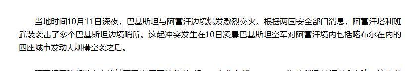 10月11日,兩國邊境爆發激烈交火,阿富汗塔利班武裝,襲擊了多個巴基斯坦邊境哨所,巴基斯坦也表示,阿富汗邊境一側的21個敵對陣地,也被短暫佔領,用於策劃和協助,針對巴基斯坦的襲擊的多個訓練營被摧毀。