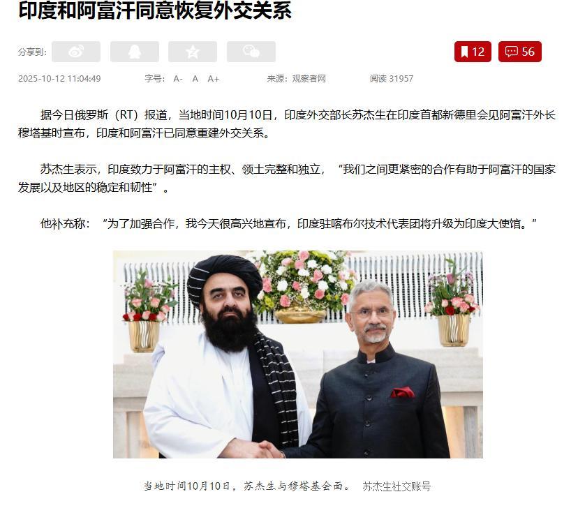 第三,阿富汗和印度關係升溫,10月10日,印度宣佈和阿富汗同意恢復外交關係。爲啥在這個節骨眼上,印度和阿富汗關係會升溫呢?