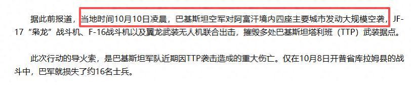 10月10日凌晨,巴基斯坦空軍對阿富汗境內,包括喀布爾在內的四座城市,發動大規模空襲。
