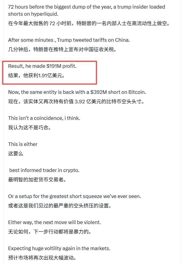 不過我覺得,特朗普不是慫了,而是賺夠了,媒體報道,在特朗普說要對中國商品加徵100%關稅前30分鐘,突然有人大舉做空虛擬幣,然後在30分鐘後就清倉跑路了,就這一個操作就賺了1.92億美元,1.92億美元是啥概念呢,就是13.7億人民幣,即便你月薪10萬,也得從唐朝開始打工,不喫不喝打工1100多年,纔能有人家這30分鐘賺得多。