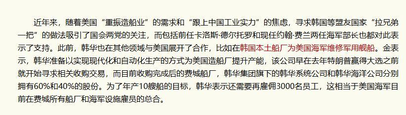 而且,早在去年年底,韓華海洋以1億美元收購了美國的費城造船廠,改名爲韓華費城造船廠,這家公司就是被中國反制的韓華海洋5家美國相關子公司之一。