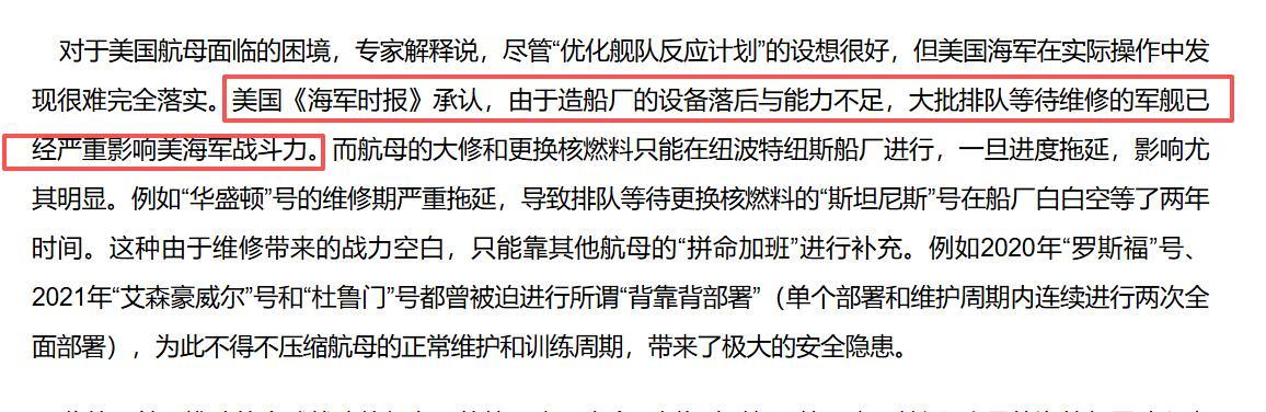 因爲造船業衰落,美國軍事霸權都受到了影響,美國現在只剩下1個船廠能造航母,2個船廠能造核潛艇。由於造船廠的設備落後與能力不足,大批排隊等待維修的軍艦,已經嚴重影響美海軍戰鬥力,比如:杜魯門號航母8個月前,與一艘貨輪相撞,雖然撞的不嚴重,但是8個月過去了,美國竟然還沒修,以至於特朗普參加海軍250週年慶典時,都只能用旗幟遮擋住遮羞。