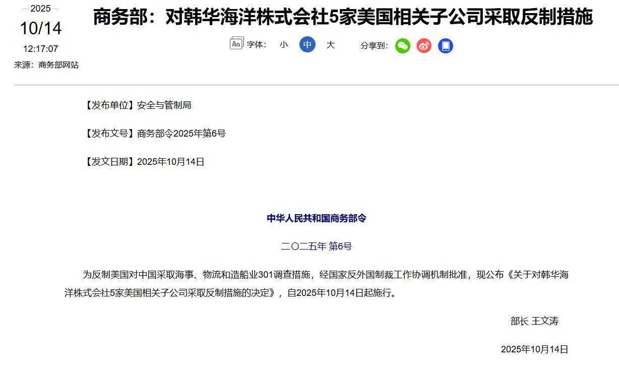 中國商務部發布公告,宣佈對韓華海洋株式會社,5家美國相關子公司採取反制措施,這次我們瞄準的是美國的造船業,美國不是要打擊中國造船業,加徵港務費嗎?那我們就專門盯着美國造船業打,這次不光是對等反制,對美國船隻加徵港務費,還要打趴美國的造船業,讓美國航母都造不出來。