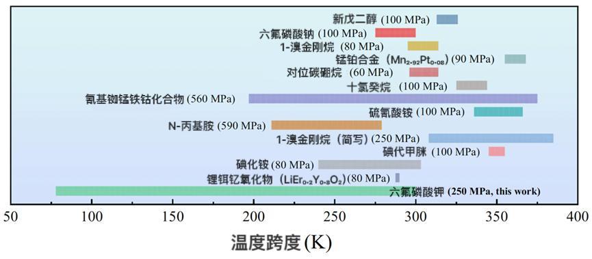 更爲奇妙的是,當對這種材料施加壓力時,會誘發形成一種高壓菱形相。這種高壓相的出現打破了傳統壓卡材料“一個相變對應一個溫區”的限制,爲實現全溫區製冷效應奠定了結構基礎。正是這種獨特的相變序列和高壓相的存在,使得六氟磷酸鉀能夠在極寬的溫度範圍內保持顯著的壓卡效應。