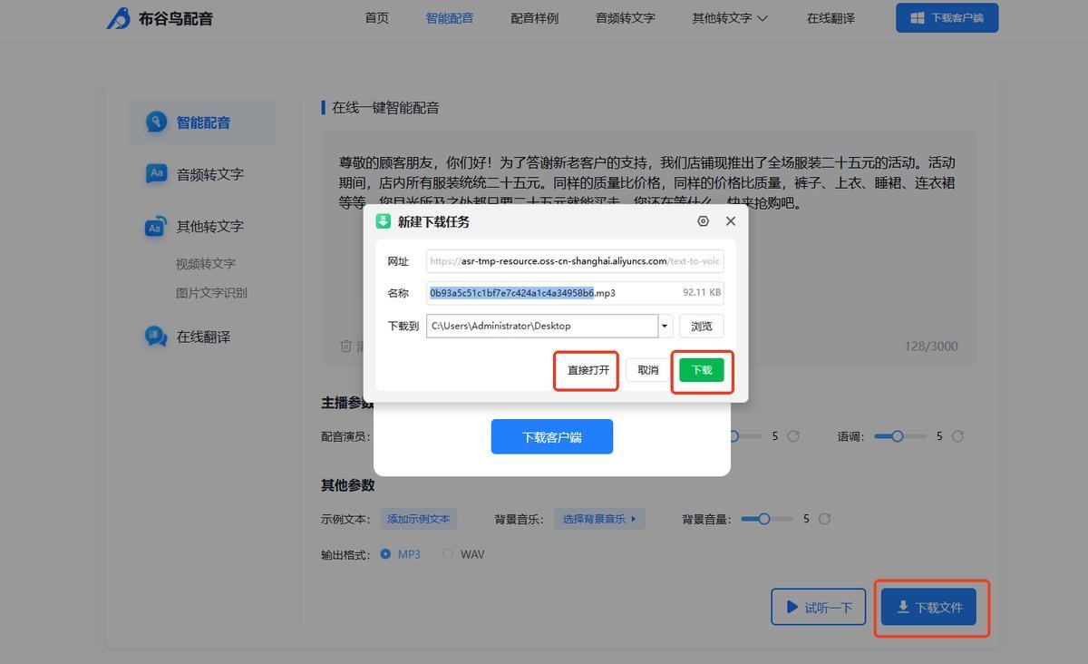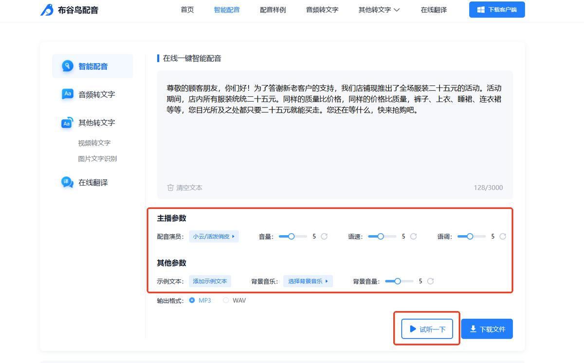 設置音色、音量、語速、語調以及其他參數,還能設置輸出格式,設置完成後點擊【試聽一下】,就能在線試聽音頻了,如果對哪方面不滿意,還能實時調整。
