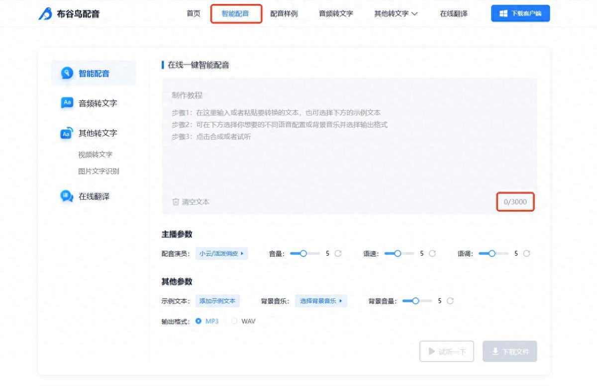 進入網站,找到【智能配音】,在文本框中輸入或者粘貼文本,一次可以導入3000字。