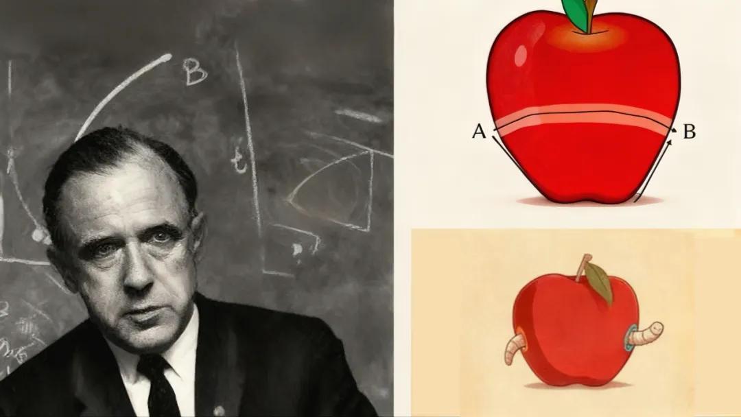 惠勒在一次演講中說:“想象一下,我們的宇宙,就是一隻蘋果的表面。一隻螞蟻,想要從蘋果的頂端,爬到底部。在它看來,這是一段非常遙遠、曲折的漫漫長路。這,就相當於我們在三維空間中,進行常規的星際旅行。但是,如果有一條蛀蟲,從蘋果的內部,直接蛀出了一條通道,連接了蘋果的頂端和底部呢?對這隻螞蟻來說,它就有了一個選擇。它可以不再辛苦地繞着蘋果皮爬行,而是直接鑽進這條由蛀蟲打通的隧道——一條‘蟲洞’(Wormhole)——從而以一個極短的距離,就抵達了目的地。”