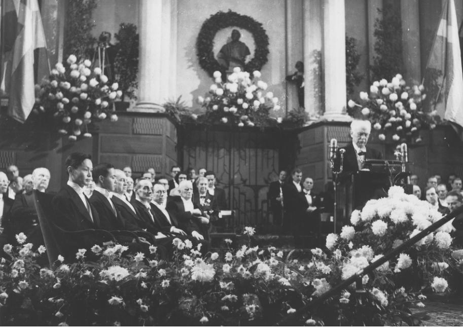 這一年的物理學獎授予了兩位年輕人——楊振寧和李政道,一位35歲,一位31歲。在一衆老人的環繞下,這兩張年輕的亞洲人面孔格外引人注目。