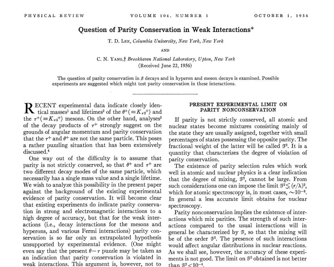 這是近代物理學史上最重要的論文之一,在這篇論文中,他們提出,在強相互作用和電磁相互作用中,宇稱在很高的精度上是守恆的,但是在弱相互作用中,宇稱守恆只是一個外推性的假設。甚至可以認爲西桃之謎恰恰是弱相互作用中宇稱守恆的反例。爲了毫不含糊地確定在弱相互作用中宇稱是否守恆,我們必須完成一個實驗來確定在弱相互作用中左和右是否不相同。