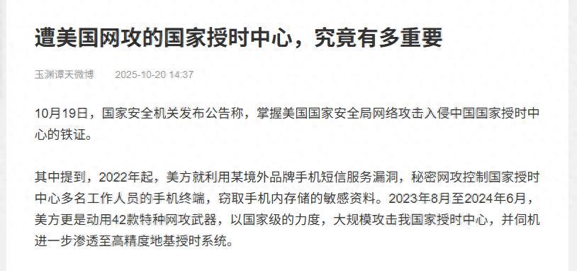 10月19日,國家安全機關發佈公告,已經掌握美國國家安全局,網絡攻擊入侵我國國家授時中心的鐵證。